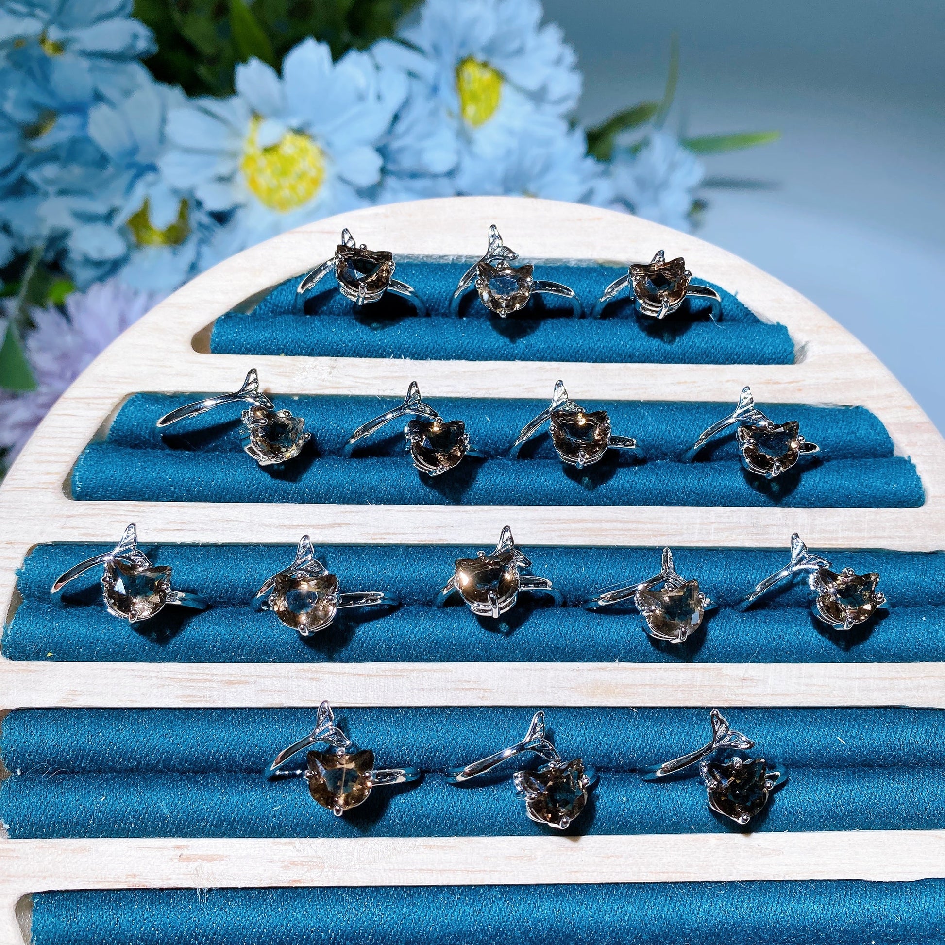 Cooper Silver Plated Smoky Quartz Cat Head Ring Crystal Healing Bulk Wholesale