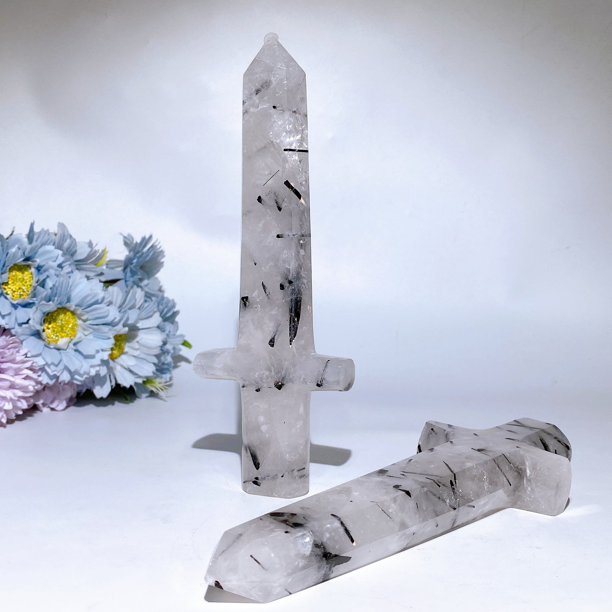 20cm Black Tourmaline In Quartz Sward Carving Crystal Healing Bulk Wholesale