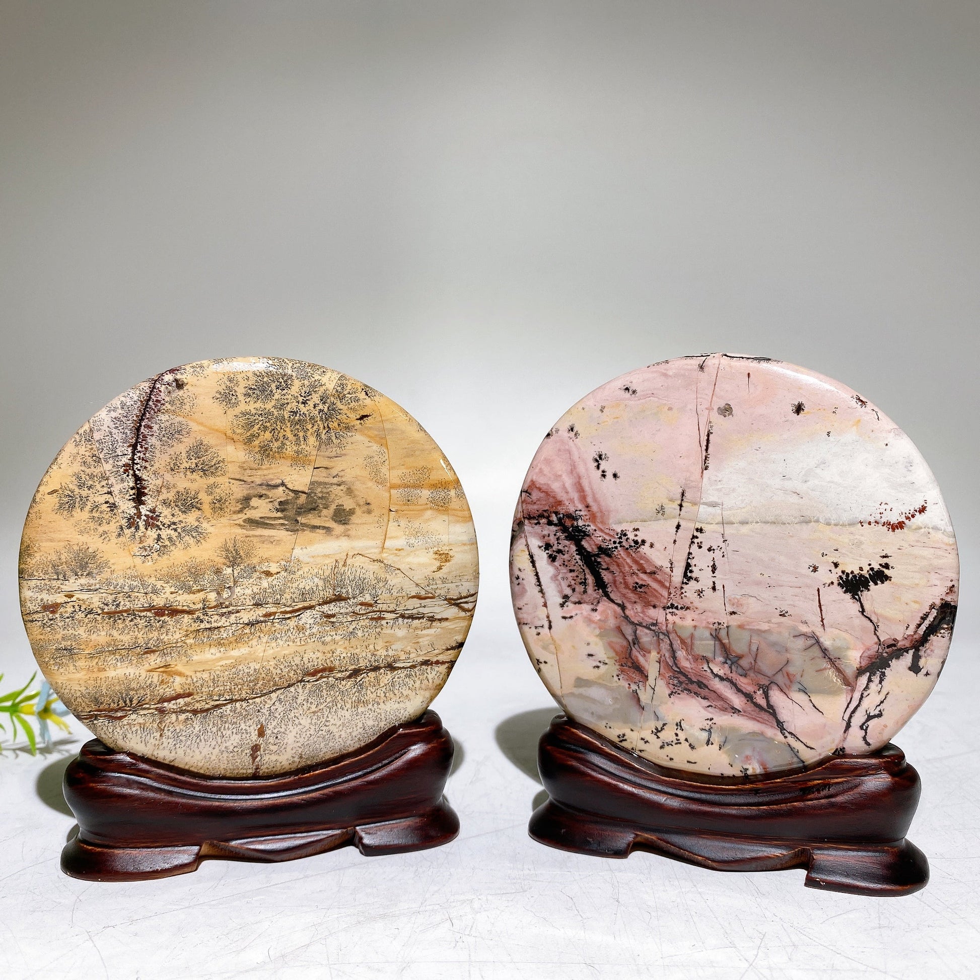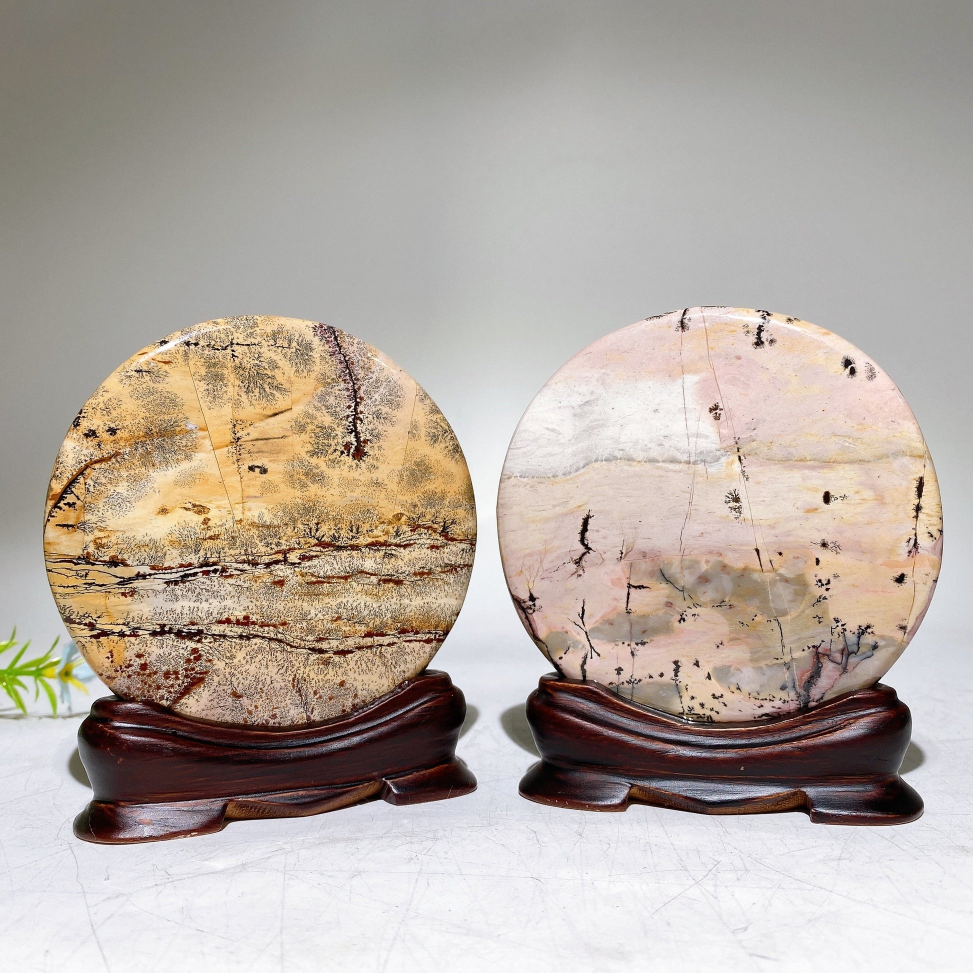 3.7" Picture Jasper Round Slab with Wooden Stand Crystal Healing Bulk Wholesale